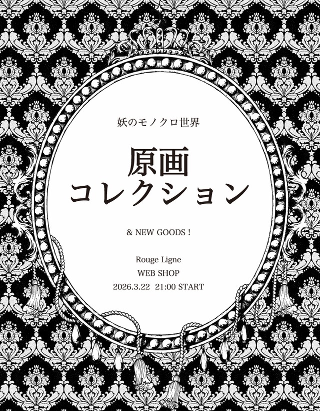 *:;;:*+*:;;:*:;;:*+*:;;:*+*:;;:* 妖のモノクロ世界 原画コレクション *:;;:*+*:;;:*:;;:*+*:;;:*+*:;;:* 世界にたったひとつだけの 妖のモノクロ世界を あなたのお部屋に―― +++ No.1 妖のモノクロ世界 ようこそ いらっしゃいませ ここは 妖のモノクロ世界 +++ 「妖さんの原画は どこで購入できますか?」 ときどきいただくこのお言葉。 基本的に原画は 展覧会で販売をしておりますが 過去の作品の原画をこの度期間限定で Rouge Ligne WEB SHOPにて 販売いたします。 なかなか展覧会には 足を運ぶことができないけれど 妖の作品をお部屋に飾ってみたい そんな方は 是非ご高覧いただけますと嬉しいです。 作品との出会いはご縁だと思います。 縁を感じていただける 作品がありましたら嬉しく思います。 *:;;:*+*:;;:*:;;:*+*:;;:*+*:;;:* ▼原画コレクション 2026年3月22日 21:00~ 3月29日 23:59まで ●税込み価格 ●送料込み <作品仕様> ●用紙:ラシャ紙 ●材料:ペン <額仕様> 「アンティーク調」のフレームです。 サイズ:太子 ●外寸…397x306x12mm ●額幅…14mm ●額色…ブラック ●表面…アクリル板(2mm厚) ●裏板…MDF圧縮合板 ●材質…木材(装飾部:石膏) ●付属…吊金具(縦横)/吊紐 ●生産…日本製 ※原画はペン画です。 ※販売は先着順です。 ※発送まで1~2週間お日にちをいただきますので、ご了承ください。 ※送料を含む価格となります。 ※発送は日本国内のみとなります。 ※画像はイメージ画像です。実際とは異なる部分がありますのでご了承ください。 ※一度海外で展示をした作品のため、箱に多少の劣化が見られますが、ご了承ください。 *:;;:*+*:;;:*:;;:*+*:;;:*+*:;;:*+ ✴︎発送について✴︎ ●他の商品を一緒にご注文の場合は、お待たせしてしまい申し訳ございませんが原画とあわせて発送させていただきます。 ●発送前に一度メールを送らせていただきますが 時間指定をご希望の方は ご注文の際「備考欄」に数字をご記載ください。 ご希望時間 1:午前中 2:12〜14時 3:14〜16時 4:16〜18時 5:18〜20時 6:19〜21時 時間のご指定がない場合は 「指定なし」にて発送させていただきます。