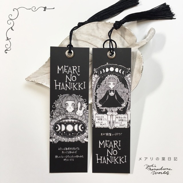 メアリの葉日記の栞です。 本を開けば… いつでもふとメアリの日記が読めます。 日常のおともに。 タッセルつきのお洒落な栞です。 A:Ligneとメアリ(刺繍枠) B:満ち欠けメアリ(全身) ●¥500+税 ●サイズ:125mm x38mm ※写真はイメージ写真です。